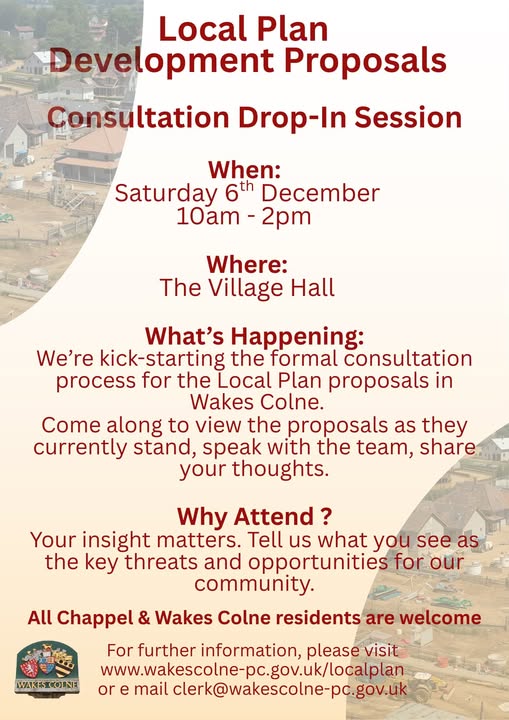 On Saturday 6th December, Wakes Colne Parish Council will be holding a drop-in session from 10am-2pm at the Village Hall. This will be your opportunity to discuss the Local Plan. Please note that there is a proposal for housing both in Chappel (35 houses) and Wakes Colne (200 houses). Residents from both Chappel & Wakes Colne are very welcome to attend to find out more about what is being proposed.